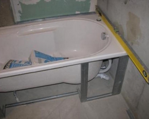 Когда изделие будет надежно закреплено, а его высота будет настроена, заделайте посредством цемента либо замазки щели между бортами и стенами. После нанесения герметичного слоя установите керамический бортик. Когда монтаж ванны будет произведен, она закрывается посредством гипсокартона. На него укладывается керамическая плитка или выполняется отделка материалом из поливинилхлорида.